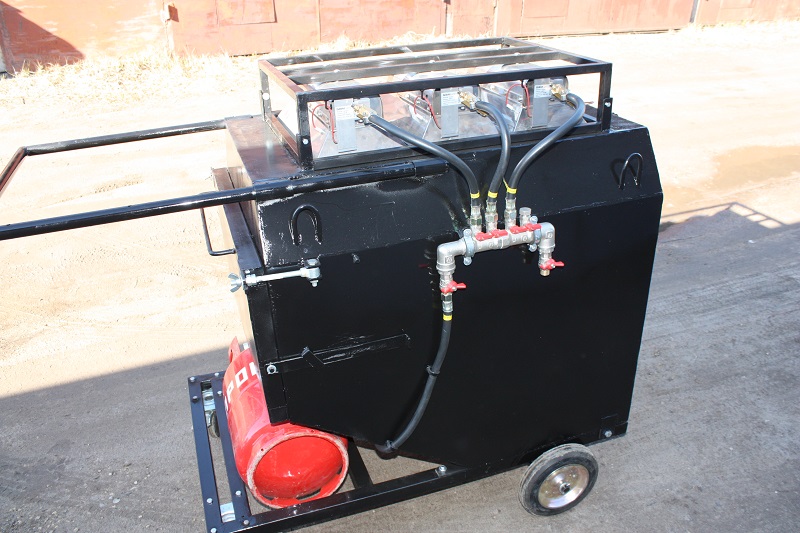 Установка обеспечивает нагрев асфальта инфракрасными газовыми горелками до заданной температуры при выполнении работ по ремонту асфальтобетонных покрытий. Нагрев асфальтовой массы осуществляется горелками, расположенными в верхней части термобокса. Загрузка асфальта производится в верхней левой или правой сторонах бункера. Нагрев асфальта происходит на решетке. Как только асфальт нагревается, то он опускается в низ через решетку. Автономность - 9 - 10 часов. Производительность переработки от 2 до 5 тонн за смену.