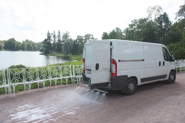 Один из самых эффективных и применяемых во всем мире способов решения проблемы пылеподавления – распыления полимеров на водной основе. Бесспорными преимуществами данного метода являются его простота и экономичность. Для проведения этих работ не требуется специального оборудования. В зависимости от обрабатываемой площади можно использовать как поливомоечные машины, так и негабаритные установки оборудованные всего лишь насосом и шлангом. Также понадобится вода для разбавления полимерного материала. Например, из всех известных способов борьбы с угольной пылью, только данная технология способна снизить запыленность воздуха в угольных забоях до уровней, близких к ПДК.